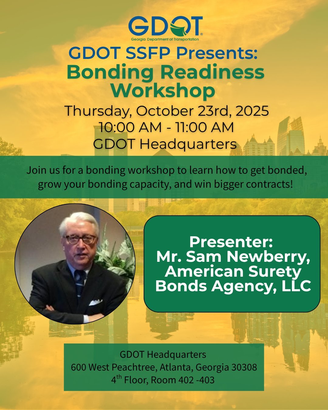 Join the Georgia Department of Transportation’s State Supported Funding Program (SSFP) for a Bonding Readiness Workshop designed to help small businesses understand the bonding process, increase bonding capacity, and position themselves to win larger contracts.